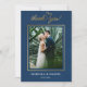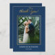 This simple and minimalistic photo thank you card features elegant gold script text with a heart between the words "thank you." You can personalise the design by adding the bride and groom's names, date, message to friends and family, and your favourite photo. This card is part of my Colourful Gold Tropical Lily Wedding Collection; please browse my collection for more matching wedding items. The card comes in four background colours: teal, blue, black, and white.