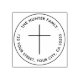 Elegant return address rubber stamp featuring a simple, thin Christian cross and your name and return address.