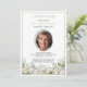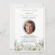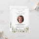 A beautiful and elegant funeral invitation adorned with simple elegant eucalyptus green leaves and classic white roses.