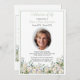 The invite features an oval shaped portrait photo with elegant simple border of a sage green line. Green eucalyptus leaves symbolises remembrance, peace, and strength.