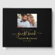 Elegant Simple Gold Script Wedding Black Guest Book Personalised. Wedding Guest Book in black and gold. Features modern „guest book” text in hand lettered swash tail font calligraphy, wedding date and couples first name with love heart motif/shape. Customise with your favourite photo and personalise your information. It great for wedding or anniversary day.