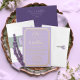 Elegant timeless lilac and lavender wedding invitation with gold script and serif lettering inside a frame