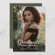 Elegant "Graduate" white script text overlay simple minimalist front photo design with coordinating white announcement message on back.