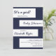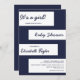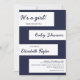 This elegant navy blue and white baby shower invitation is perfect for a modern wedding. the simple design features elegant blue calligraphy on white stripes on a navy blue background.