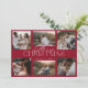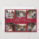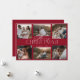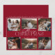 This Six photo Christmas Card features a background that is a muted red, creating a calm, festive atmosphere. "Merry Christmas" is displayed prominently in the centre, written in an elegant script font with a refined, silvery finish, though it lacks the foil shine of the previous version. This gives the card a more subtle, understated elegance.