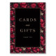 This is a gothic style image featuring an elegant black background framed by intricate red roses and skulls. The composition exudes a sophisticated yet mysterious vibe, perfect for those who appreciate the darker side of beauty. The text "Cards and Gifts" in gold adds a touch of luxury and formality, making it ideal for special occasions or as a unique thank you note. It inspires feelings of appreciation wrapped in a bold, artistic presentation.