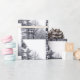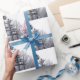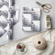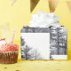Make your gifts stand out in elegant wrapping paper featuring a black and white photograph of snow-covered trees in a half-drop repeating pattern. The treetops form a strong diagonal with the tallest tree starting at the upper left corner of the image and the shortest tree at the bottom third of the right edge. The two trees on the left are evergreens while the rest are leafless deciduous trees; all are covered with snow. The sky above them is white. Perfect for Christmas and other holidays and occasions.