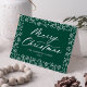 Elegant holiday card with "Merry Christmas" displayed on the front in a bold white calligraphy script with a white snowflake and pine branch border on a green background. Personalise the front of the non-photo holiday card by adding your name and the year. The inside of the card provides space for your typed or handwritten personal message. The back of the modern holiday card features a beautiful snowflake pattern.