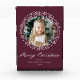 Create a beautiful holiday keepsake with our Christmas photo block featuring your photo encircled by a wreath of white snowflakes and pine branches on a berry purple background. "Merry Christmas" is displayed in a bold white calligraphy script with your name and the year shown below.