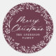 Seal Christmas presents, favour bags, and holiday envelopes with festive Merry Christmas stickers. The holiday stickers feature "Merry Christmas" displayed in a white calligraphy script encircled by a wreath of snowflakes and pine branches on a berry purple background. Personalise the stickers by adding your family name or custom text.