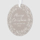 Elegant holiday photo ornament featuring "Merry Christmas" displayed in a white calligraphy script encircled by a wreath of snowflakes and pine branches on a light taupe background. Personalise the front of the ornament by adding your family name and the year. The back of the ornament features your favourite family photo making it the perfect keepsake to give to friends and family.