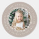 Add a festive touch to your holiday envelopes with our Elegant Snowflake Wreath return address labels. The holiday return address stickers feature your photo encircled by a wreath of white snowflakes and pine branches with a taupe background. Your last name and return address are displayed on the outer edge of the round holiday stickers in white lettering.