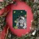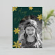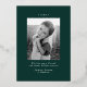 Elegant holiday photo card featuring your vertical photo framed by a spruce green arch and gold foil snowflakes. "Merry Christmas" is displayed in a gold foil calligraphy script. Personalise the front of the gold foil Christmas card by adding your name. The card reverses to display an additional photo, the year, and your custom message in white lettering on a dark green background.