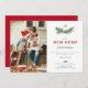 An elegant and classy, simple, address change family Christmas card with template for a vertical photo, featuring a couple of small branches of winter spruce framing the family monogram, with typography and calligraphy in Christmas foliage green and red. A lovely botanical, "we've moved" Christmas card that you can personalise with your name(s), the year and family pictures (or children's picture etc.). A moving announcement that is elegant and stylish.