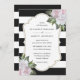 Invite your guests to your elegant black and white wedding party with these pink floral wedding invitations featuring pink flowers and greenery on a black and white striped background.