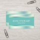 Modern business card design featuring faux copper gold metallic texture, light teal stripe and elegant calligraphy font.