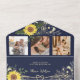 Invite your guests with this elegant all-in-one wedding invitation, featuring vibrant watercolor sunflowers set against a deep navy blue background. The design is enhanced with faux rose gold floral lace accents and modern calligraphy, blending rustic charm with contemporary sophistication. A built-in QR code offers a convenient way for guests to access your wedding website or RSVP online. Perfect for autumn weddings, barn venues, or any celebration embracing a rustic-elegant theme.