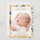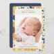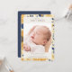 Beautiful sunflower pattern vertical photo birth announcement with a large single photo on the front and space on the back for two more horizontal pictures. Pretty patterned frame on the front in shades of yellow and blue, with elegant calligraphy style script and sans serif typography fonts.