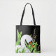 Stylised bird art on tote bags of a white Mute Swan on black background
