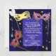 Festive Masquerade Ball Sweet 16 birthday party invitation done in a dark blue, with graphics of swirls and glitter like designs, on the background. Graphics of three ornate face masks decorate the top and left side of the text area along with gold tone glitter looking stars and baubles. Text in white and pale yellow is fully customisable for you to personalise for your event. Great for birthday parties, Masquerade Parties, Halloween, Carnival, and Mardi Gras.