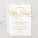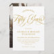 Elegant white 50th wedding anniversary dinner invitation in white with golden fonts. 50th wedding anniversary invitation with golden fonts against a white background. Fifty Years in a swirly golden script. Add a photo of the happy couple celebrating their 50th wedding anniversary on the back of the white and gold invitation. All gold details are a golden beige colour only and not gold foil.