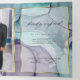 Ethereal splash of alcohol ink stains in shades of ocean blue, teal and rich amethyst purple - each section highlighted with a sheer white gold framed overlay, on the front centre is your photo accented with a double gold frame and behind the sheer white overlay for an esoteric appeal - inside the cover is a second photo of your choice - the wedding invitation is centre and the detachable rsvp is on the last section. This invitation is designed to be mailed as is folded without envelope - This beautiful modern abstract design is perfect for an all in one wedding invitation complete with pre-addressed detachable meal choice rsvp for your guests to easily mail back - a stunning all in one wedding invitation -