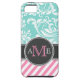 Personalised Elegant teal blue and white floral damask pattern with diagonal bubblegum pink stripes. Add your initials.