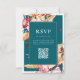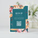 Modern fall wedding rsvp cards with elegant boho fall floral accents of dahlia flowers and autumn botanical leaves, minimalist typography design on teal background. Add your own personalised QR code with custom wedding website url.