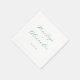 This wedding napkin features a minimalist and elegant design with a clean white background. The layout includes flowing script typography for the names, paired with a simple sans-serif font for clarity, all in a fresh teal color. The balanced composition emphasizes sophistication and modernity, making it perfect for an intimate and formal celebration. Its restrained aesthetic focuses on the significance of the occasion without any additional motifs or decorations.