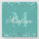 Elegant Teal Glitter Blue Green and White Monogram stone coaster with a customisable calligraphy script name and bold monogram template.