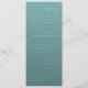 This elegant wedding menu features a minimalist design with a soothing teal background and crisp white text, creating a sophisticated and inviting atmosphere. The layout is clean and structured, with sections for Starters, Salad, Main Course, and Dessert clearly defined in bold sans-serif headers, while the item descriptions are presented in an easy-to-read serif font. Customisable placeholders at the bottom allow for personalisation with names and dates, making it perfect for formal events. The overall style is modern and refined, ideal for couples seeking a chic and uncluttered aesthetic for their special day.