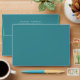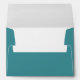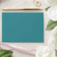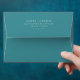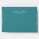 This wedding envelope features a minimalist design with a calming teal background and crisp white text, creating an elegant contrast. The layout is vertically orientated, with evenly spaced lines of centred text that enhance readability and sophistication. Utilising clean, serif typography, the design exudes a formal and refined mood, perfect for conveying essential details in a stylish manner. Its simplicity makes it ideal for weddings or formal announcements, offering a modern yet classic aesthetic.