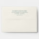 This wedding envelope features a minimalist design with centered text on a plain white background, creating an elegant and modern look. The muted teal color palette adds sophistication without overwhelming the clean layout. The typography is crisp and clear, using a serif font that enhances readability and formality. Perfect for couples seeking a timeless yet contemporary aesthetic, this envelope conveys professionalism and refinement, making it ideal for formal correspondence or special occasions.