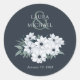 These elegant 3" x 3" classic round wedding stickers feature a beautiful floral design in teal, mint and white on a black background with placeholders for the bridal couple first names and wedding date.
