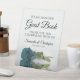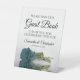 This beautiful pedestal sign will invite your wedding guests to sign your guest book. Features an elegant design with a single long-stemmed teal, turquoise, or dark aqua coloured rose lying on its side mirrored in a pool of water. There is space for the names of the couple as well as the wedding date.