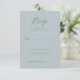 This elegant wedding RSVP card features a minimalist design with a soft, muted teal background that creates a serene and sophisticated atmosphere. The layout is clean and uncluttered, with ample negative space around each element, ensuring clarity and focus on the essential details. A mix of cursive and serif fonts adds an inviting yet formal touch, while customizable fields allow for personalization. Perfect for couples seeking a simple yet stylish way to manage their guest list, this card conveys a mood of calm elegance ideal for any wedding celebration.