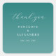 This square sticker features a minimalist and elegant design with a gradient background transitioning from deep teal to lighter turquoise, creating a calming and sophisticated atmosphere. The layout is centered around the word "thankyou" in an artistic cursive script, complemented by customizable placeholder text for names and dates below it. The typography combines delicate script with bold sans-serif fonts, enhancing readability and visual appeal. Perfect for expressing gratitude or celebrating special occasions, this design balances simplicity with a touch of personalization, making it ideal for events like weddings or milestone celebrations.