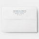 This wedding envelope features a minimalist design with centred text on a clean white background, creating an elegant and modern look. The muted teal blue colour palette adds sophistication, while the serif font ensures readability and visual consistency. With ample negative space, this design emphasises clarity and simplicity, making it perfect for couples seeking a refined and professional aesthetic for their special day.