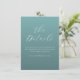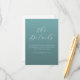 This wedding enclosure card features a minimalist and elegant design with a solid teal background that creates a calming and sophisticated atmosphere. The layout is vertically aligned, showcasing the phrase "The Details" in an ornate script font at the center, followed by clean sans-serif text guiding guests to visit a website for more information. The color palette of soft teal and white enhances readability and adds a touch of contemporary elegance. Perfect for formal occasions, this card combines modern typography with ample negative space, ensuring clarity and focus while conveying a mood of warmth and personalization.