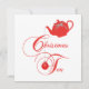Elegant christmas ball ornaments and teapot covered in red lace with red bows and silver trimming on a white background grace this unique holiday tea invitation. The beautiful vintage lace motif of interlacing stars and flowers on the Christmas ornaments is reminiscent of the ancient craft of lace-making.