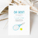 Serve up excitement with our tennis-themed baby shower invitation, adorned with adorable baby blue rackets and a classic green tennis ball. This playful and charming invite sets the perfect scene for a joyous celebration in honour of the little champion on the way!