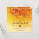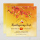 Elegant invitation with with a bokeh background in orange and yellow with a Japanese maple, a bird, pie, cider, and a pumpkin.