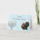 Beautiful Thanksgivukkah greeting card done in blue, with graphic artwork of a silver menorah and a turkey. Personalise the text inside and out to read what you want.