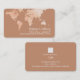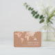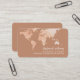 Modern and professional business card with name (manuscript font style) and custom travel related occupation (travel agent), with the image of a map of the world... and templates for logo, slogan, address, email and phone at the back... it's a terracotta boho brown solid background color, a warm brownish hue.
