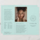 Elegant trifold brochure featuring a modern design with an abstract flower over a turquoise / aqua background. If you prefer, you may replace the abstract flower image with your own logo in the template form. The template includes markers for the folds and you may remove them in the design editing tool. This trifold brochure is great for an aesthetician, hair stylist, makeup artist, beauty salon or nail salon.