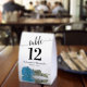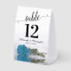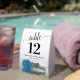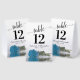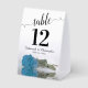 These tent signs will not only help your guests find their tables, they'll also make your wedding reception more beautiful. The design is both elegant and romantic featuring a single sky blue, turquoise, or azure coloured rose lying on its side reflecting in water with waves and ripples. The title is in lacy script calligraphy with bold numbers so your guests can easily find the right table. There is room for the names of the couple and the wedding date.