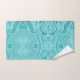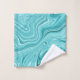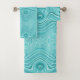 An elegant turquoise bath towel set with an abstract fluid marble pattern.