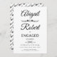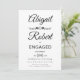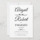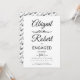 Elegant typography black and white flowers simple floral engagement party invitation. It showcases your names in a cursive script handwritten style typography and two small black flowers with green leaves on both sides of the ampersand. The back features a floral pattern.