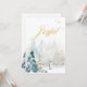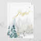Elegant Christmas watercolor foliage woodland snow scene with lovely penguin. Elegant script typography in gold "Joyful" Watercolor in greens and blues.