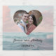 These coastal beach wedding photo sparkling wine labels are both an elegant and unique way to add extra personalisation to your wedding. Serving as both decorative and functional, these wine labels are complete with an ocean wave background, names of the bride and groom, the wedding date, and your own photo cut into a heart shape. This design is perfect for any beach wedding or any wedding that would like to add some ocean vibes. Enjoy!